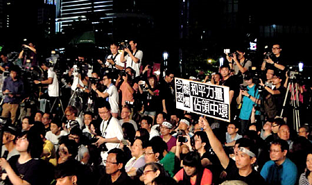 (新唐人亞太電視台NTDAPTV/聯合報)「公民抗命!誓不低頭!」香港占中運動發起人戴耀廷在台上與台下群眾一同高喊。香港泛民主派今晚在添馬公園發起集會,即使晚間下雨,仍超過上千名香港民眾參與,並高舉「真普選」的標語表達訴求。現場有不少學生擔任志工引導活動路線,以及呼籲連署公民提名,不要假普選等宣傳活動。還有人當場剃光頭以示抗議。抗議期間,民眾和平靜坐,高唱「海闊天空」,現場未爆發激烈警民衝突。香港「占中行動」秘書處晚間發表聲明說,人大常委會今天就2017年香港特首選舉定下極其狹窄的框架,扼殺真普選,令特區政府第二輪政改諮詢淪為虛偽鬧劇,和平佔中對此表示極度遺憾。北京一方面說大部份泛民和港人都是愛國愛港,另一方面卻認為讓港人自由選擇,便會選出危害國家安全的特首。這種自相矛盾的說法只反映中央的「心魔」。