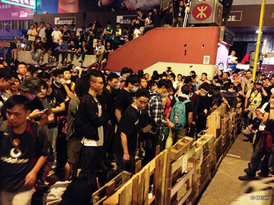 (TVB晚間新聞)大批示威者繼續佔據旺角的多條道路,在彌敦道與亞皆老街交界,近匯豐銀行的整段亞皆老街,已被約100名示威者重新佔據,示威者用木板作路障,與警員對峙,暫時氣氛平靜。