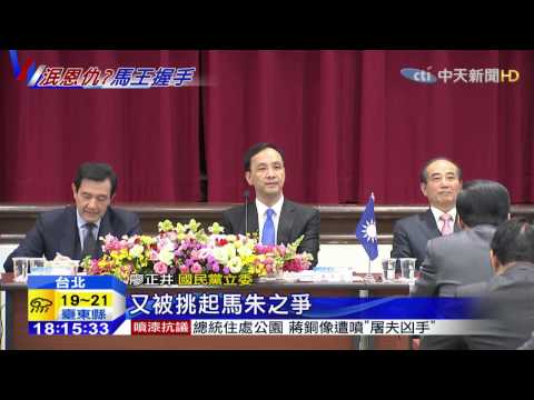 (中天新聞CH52/中央社)國民黨立法行政部門議事運作研討會,黨主席朱立倫親自到智庫門口迎接總統馬英九到來。馬總統步入會場後,主動跟立法院長王金平握手,台下報以熱烈掌聲。中國國民黨今天下午於智庫舉辦立法行政部門議事運作研討會,由於朱立倫上週宣布不承接王金平黨籍訴訟案後,馬總統以個人名義發表聲明表達不滿,因此馬總統、朱立倫、王金平3人下午的互動備受關注。研討會召開時,朱立倫刻意在智庫門口親自迎接馬總統到來,隨後步入會場後,馬總統還主動跟王金平握手,黨籍立委在台下報以熱烈掌聲。