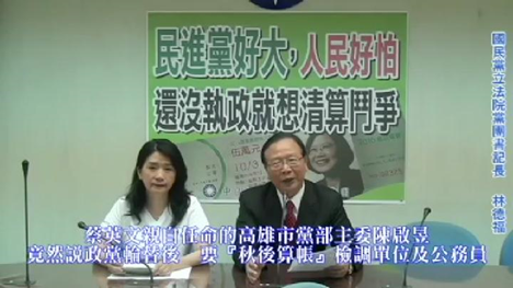 (UPolicy KMT)民進黨總統參選人蔡英文近日在全台舉辦多場募款餐會,但至今沒有公布捐款項目等資料,甚至傳出有支持者一人購買30張五萬元餐券,違反《政治獻金法》規定;日前還有支持者向媒體亮出五萬元餐券時,遭工作人員『鎖喉架走』的離譜行為。因此,國民黨團要求檢調單位調查,民進黨募款餐會是否有不法情事?但昨天(9/25)蔡英文親自任命的高雄市黨部主委陳啟昱卻公開說出,將來政黨輪替後,民進黨要『秋後算帳』檢調人員及公務員!對此,國民黨團痛批,民進黨還沒執政,就想要『恐嚇』官署及公務人員!如此囂張的行為,已將台灣努力多年才達成的民主、法治等傲人成果,全部毀於一旦!國民黨團只是要求檢調單位調查募款餐會是否一切合法,民進黨的回應卻如此手足無措,可見其中必定有『不能說的秘密』,蔡英文應該立即面對,公開向全民說明!國民黨團希望全民能夠認清民進黨的真面目,同時也呼籲民進黨不要再用『顏色』看待是非,永遠有『雙重標準』!要競逐總統大位的蔡英文也應該立即向全民說清楚講明白,否則就是縱容民進黨恣意妄為、藐視台灣的民主法治!
