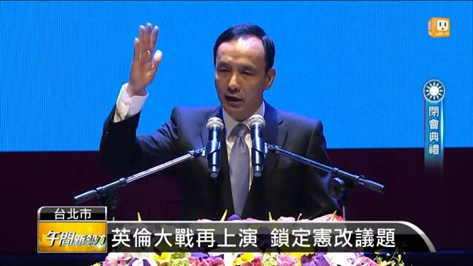 (聯合影音網)國民黨昨天通過:徵召朱立倫參選總統後,,朱立倫馬上公開邀請蔡英文辯論,同時也提出憲政改革、跟國會改革的想法。不過蔡英文今年三月,就已經表態,反內閣制,支持總統直選。但她因為曾經態度反覆,所以朱立倫這次一出手,就鎖定憲改議題,要強攻國會席次。臨全會清理戰場,朱立倫登上舞台,一開口馬上下戰帖,要跟蔡英文正面過招,憲改、國會改革英倫大對決。國民黨主席朱立倫:最高目標是推動內閣制,但是短期我們一定希望達到,重建內閣同意權,也就是行政院長同意權制度,我們要透過辯論的方式,明白的請蔡主席告訴我們。兩黨主席雙雙拋憲政改革,再先後躍升總統參選人,檯面上有人為總統大夢各自盤算,有人則要藉由憲政改革牌,累積爭奪國會席次正當性。
