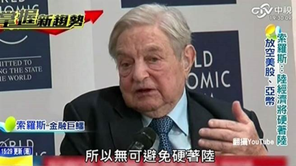 (中視新聞/中時電子報)2016年的大陸經濟走向如何?知名的金融巨鱷索羅斯持悲觀態度,他說大陸經濟會硬著陸,拖累全球通貨緊縮,為此他已經大舉放空美股和亞洲貨幣,不過大陸官媒則撂狠話警告,做空人民幣是死路一條。年度達沃斯的世界經濟論壇上,全球知名的金融巨鱷索羅斯在接受專訪時語出驚人,他說大陸經濟前景相當不妙,正一步步走向硬著陸,將導致全球通貨緊縮,重演2008年全球金融危機。大陸耗費太多時間從投資導向轉型成,國內消費導向,所以無可避免硬著陸,索羅斯指出大陸目前經濟成長率只有3.5%,遠低於官方新數據顯示,去年第四季成長率6.8%,大陸資本外逃過度負債,都是經濟硬著陸的跡象,經濟放緩、原油與原材料價格下滑和匯率競相貶值將使世界通縮的風險上升,拖累2016,成為市場困難的一年。為此他已經大舉放空美股和亞洲貨幣,同時買進美國公債,索羅斯在1992年狙擊英鎊,一戰成名,狂賺超過10億美元,1998年曾做空香港資本市場鎩羽而歸,當時香港股市房市跌幅都超過50%,大陸官媒新華社近日發表措辭嚴厲的評論,警告「索羅斯們」做空人民幣是死路一條,將蒙受巨大損失和法律後果,日本央行總裁黑田東彥則建議大陸實施嚴格資本管制,協助遏止龐大熱錢外逃並穩定人民幣匯率。