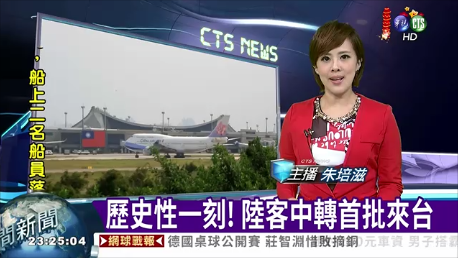 (中華電視公司)歷史性的一刻!歷經幾番波折,陸客中轉在今天正式起動!第一班來到中華民國台中轉的班機是大陸東航,從南昌起飛前往曼谷,早上10點20分抵達桃機中轉。搶頭香的兩名陸客,潘春明、陳燕,抵達桃機後,華航及海基會分別送上了飛機模型、郵冊和茶葉,兩人也在機場買了金門高粱酒及保溫杯,隨後花不到兩分鐘,就到出境層,還在櫃檯上寫了春字,短暫停留後,兩人在下午1時55分搭乘華航班機,前往曼谷。另外,今天預定還有6名分別來自重慶、昆明的陸客,將透過桃園轉機前往第三地。陸委會表示,希望陸客來到中華民國中轉制度化,變成全面性的中轉,不但落實馬習會協商結果,對航空產業發展,也十分有利。