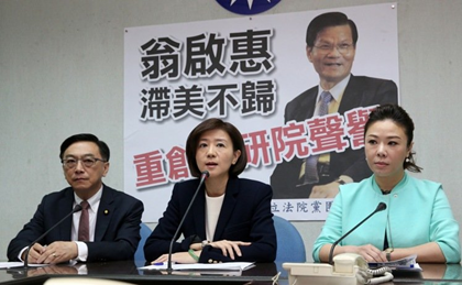 (UPolicy KMT/聯合新聞網)(3/31)上午10:00,國民黨立法院黨團記者會將進行網路直播。討論議題是「翁啟惠滯美不歸 重創中研院聲譽」記者會,出席委員有立法院黨團副書記長王育敏、副書記長李彥秀、立法委員陳宜民。浩鼎案風波愈演愈烈,中研院長翁啟惠請辭並以健康狀況為由滯美不歸,國民黨立委王育敏、李彥秀、陳宜民上午舉行記者會,指出翁啟惠曾經承諾要回台說明並赴立法院專案報告,結果卻滯美不歸,除呼籲翁啟惠儘快回台說明外,也抨擊翁啟惠重創中研院聲譽。