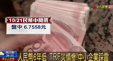 (USTV非凡電視台)大陸人行下調人民幣兌美元中間價,創下6年來的新低,中華民國國內投資衍生性金融商品TRF的中小企業叫苦連天。