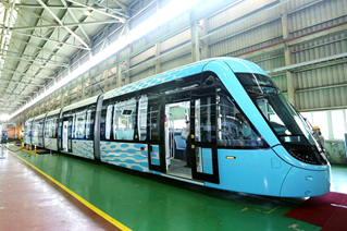(朱立倫FB)淡海輕軌,是中華民國台灣第一個使用「國車國造」的捷運。我們相信,中華民國台灣廠商絕對有這樣的能力,更希望藉著淡海輕軌,讓未來的捷運建設,可以有價格更合理,但品質不輸進口的選項。明天,中華民國台灣第一輛「國車國造」的捷運車廂,就要和大家見面!這就是中華民國台灣第一輛國產的輕軌捷運車輛,「行武者號」!行武者號的外型,是以河海為意像,水藍色代表淡水河的流水,藍白交錯,則是河面的波光粼粼;加大的觀景窗,讓乘客可以一覽淡海風光;許多設計,也都有因應淡水的氣候特性做出調整。